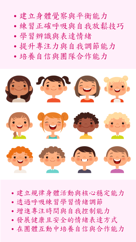 本課程以 兒童瑜伽 為核心,結合 身體覺察、情緒表達、藝術創作與自然探索,透過多元體驗,引導孩子在活動中認識自己、培養專注力與內在穩定。